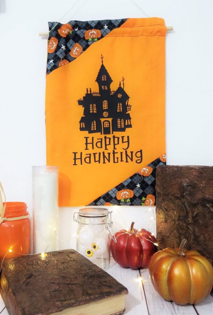 You’ll create beautiful contrast using different fabrics on each side. Simply sew the pieces together, add vinyl lettering with your Cricut, and hang from a wooden dowel.